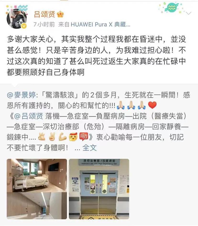 吕颂贤也转发老婆的微博,表示多谢大家关心,其实他整个过程都在昏迷中,并没有感觉,只是辛苦身边人,为他难过担心啦!不过这次真的知道了什么叫死过返生,大家真的在忙碌中要照顾好自己的身体。